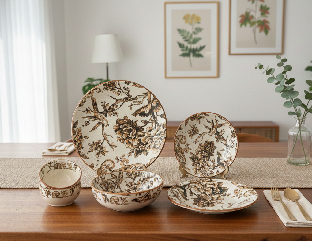 Upgrade your dining experience with this elegant Dinnerware set, designed to bring warmth, style, and functionality to your everyday meals. Featuring a beautifully coordinated collection of full plates, quarter plates, serving bowls, and small bowls, this set blends timeless floral aesthetics with modern craftsmanship. The earthy tones and intricate botanical patterns add a sophisticated charm to both casual family dinners and special occasions. Crafted from high-quality ceramic, each piece offers a smooth finish, balanced weight, and long-lasting durability for daily use. This Dinnerware set is ideal for serving Indian meals, continental cuisine, or festive spreads, making it a versatile addition to your kitchen collection. Easy to clean and thoughtfully designed, it complements wooden tables and neutral interiors perfectly. Whether you are refreshing your home décor or searching for a thoughtful gift, this ceramic collection delivers elegance, practicality, and lasting appeal. Perfect for modern homes that value design, quality, and a refined dining presentation.