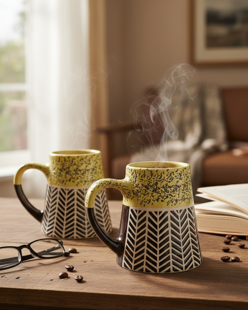 Handcrafted Ceramic Coffee Mug – Yellow Textured & Black Herringbone Geometric
