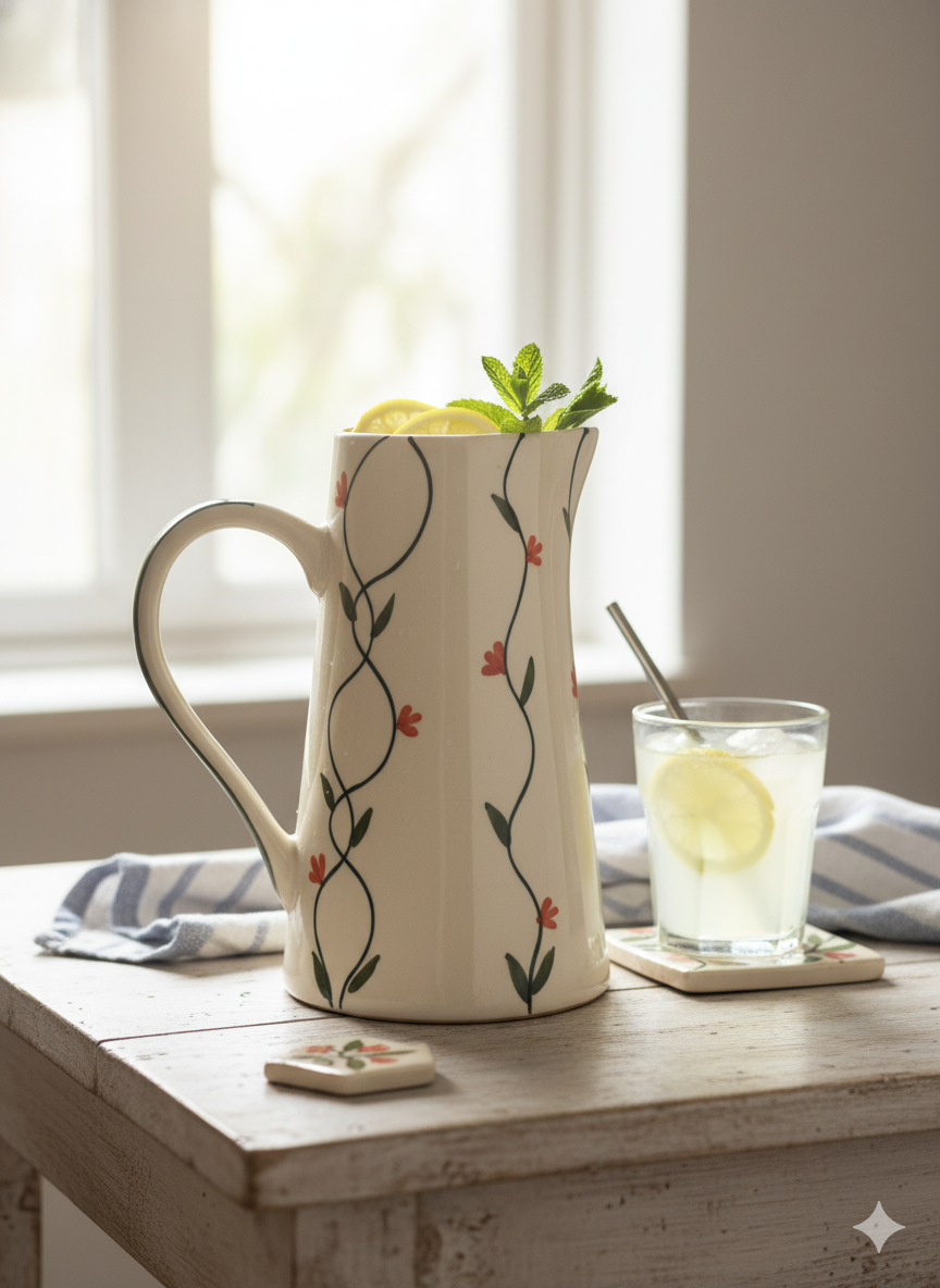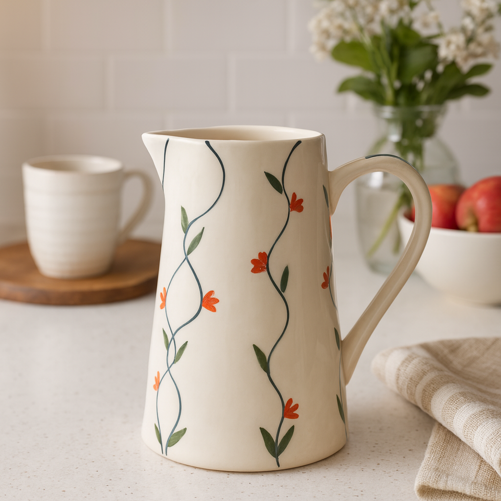Ceramic Pitcher Jug – a beautifully handcrafted jug featuring delicate floral vine artwork, perfect for home décor, kitchen styling, dining table setups, and gifting. This premium ceramic pitcher adds charm, warmth, and elegance to modern Indian homes. Made with durable, lead-free ceramic and a generous 1500 ML capacity, it is ideal for serving water, juices, infused drinks, or for use as a rustic decorative accent. Shop artisan-made products from Kaolinite Ceramic and bring timeless craftsmanship into your space.