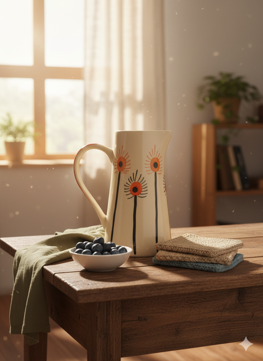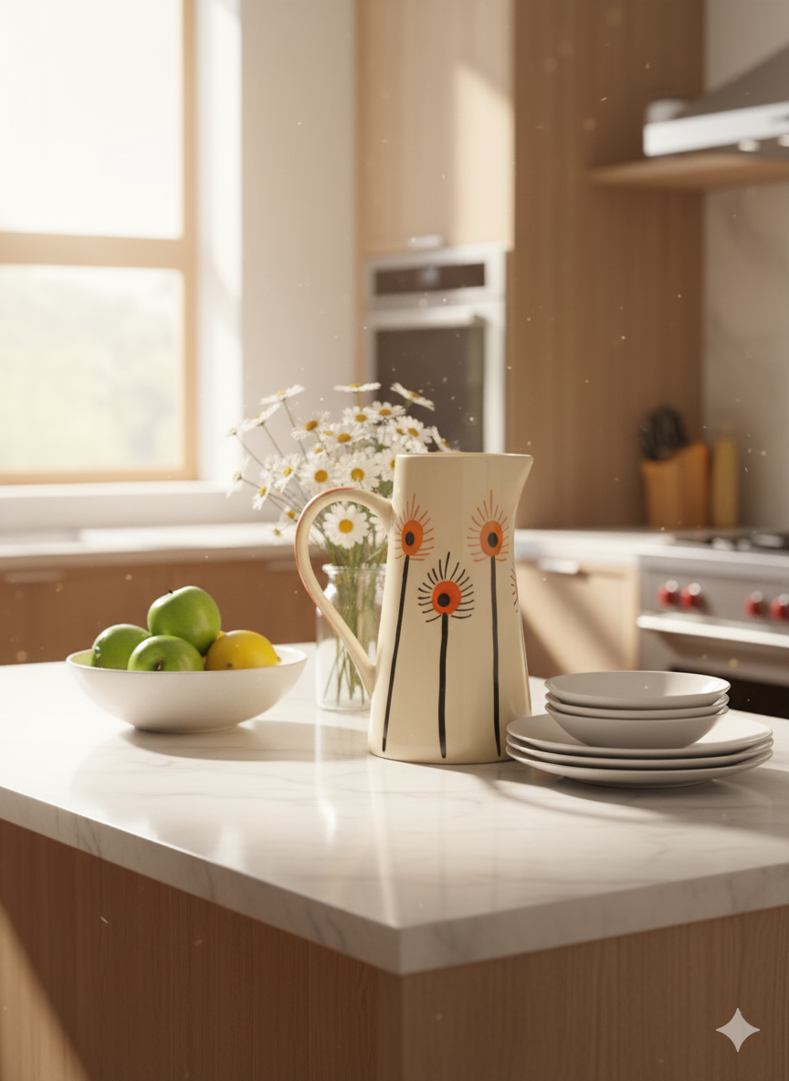 In today’s Indian homes, décor is all about aesthetic minimalism and warm handcrafted elements—and this pitcher fits beautifully into that trend. Its artistic floral design makes it a stunning statement piece, whether placed on a dining table, kitchen shelf, or bedside console.