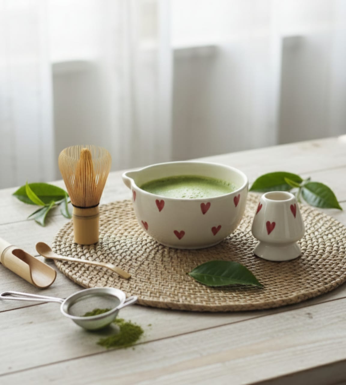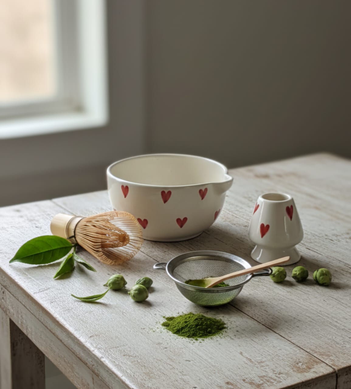 Heart Ceramic Matcha Set – Handcrafted Bowl and Whisk Holder
