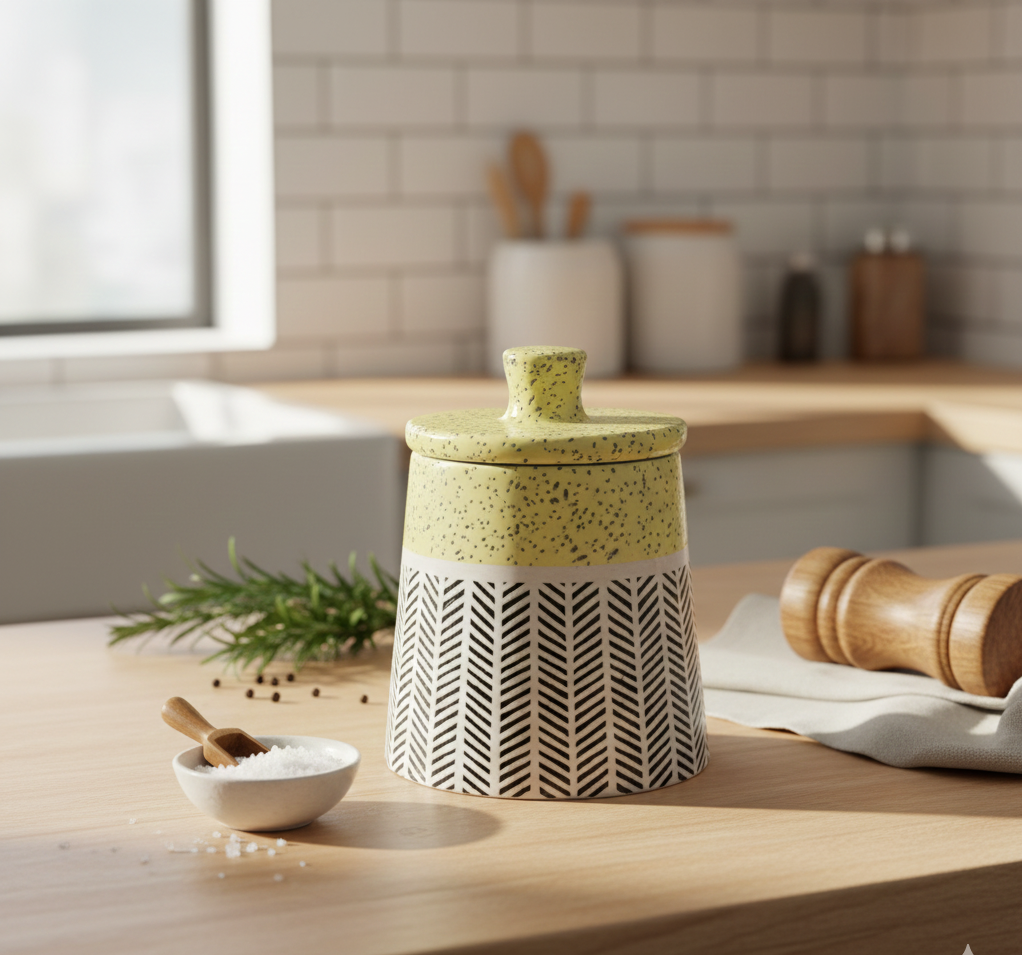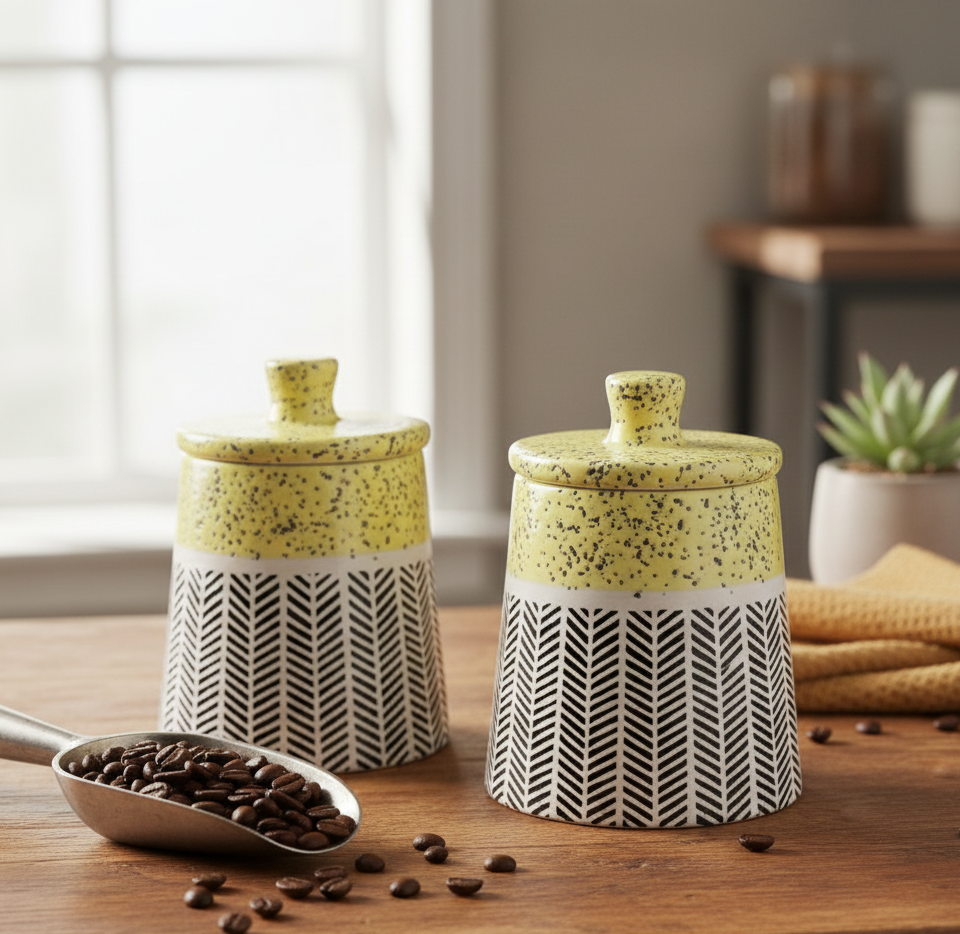 The Artisan Stoneware Ceramic Storage Jar – Light Yellow & Charcoal Geometric Motif