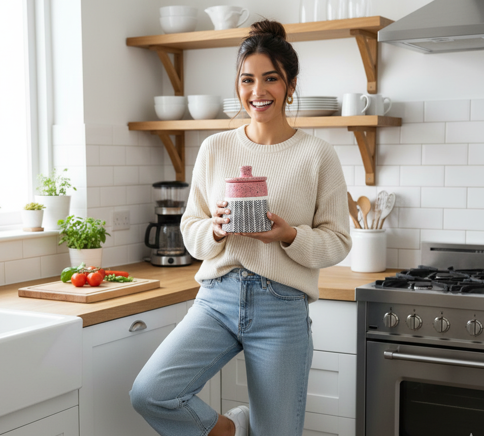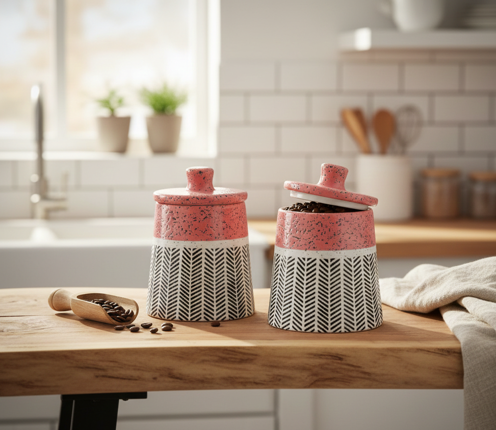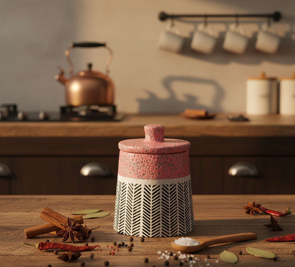 Be the first to review “The Artisan Stoneware Ceramic Storage Jar – Pink & Charcoal Geometric Motif”